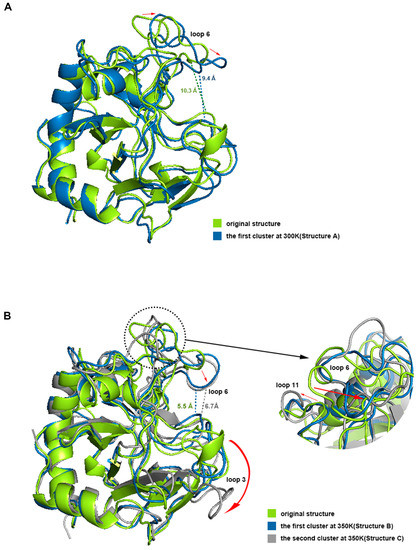 We aligned structures A, B, and C with the initial structure (Figure 9). The results showed that the opening of the binding site in loop 6 sunk a little at 300 K, but the narrowest width of the opening only dropped from 10.3 Å to 9.2 Å, which did not affect the binding with chitosan at all. Loop 3 and loop 11 also had some deviation. However, the difference between structure A and the initial structure was not significant from the overall view, especially the binding site, which still maintained the same structure and size as the original one, which is consistent with the results of the previous RMSF analysis. Compared with the initial state, the most significant change in structure B is that the opening of the site within loop 6 sunk significantly, and the narrowest width was reduced to 5.5 Å. Because the opening was transformed into a flat lying state, the effective vertical distance directly opposite the catalytic site was only about 3.8 Å. This structure showed a closed conformation, which makes it impossible to accommodate the chitosan molecule. Structure C at 350 K did not change much in terms of the size of the opening compared to structure B, but loop 3 shifted significantly outward, completely leaving the position of the binding site in the initial state, which may adversely affect the binding of chitosan. Meanwhile loop 11 showed a large outward shift, which resulted in the distance between the closest residue pair, with loop 6 being pulled away from 4.2 Å to 10.1 Å. This may be the reason for the significant decrease in the positive correlation between loop 6 and loop 11 in the above dynamic cross analysis. The above analysis shows that the conformations of loops 3, 6, and 11 all changed a lot at high temperature, and these changes, especially the change of opening from open to closed, will hinder the binding with the ligand.