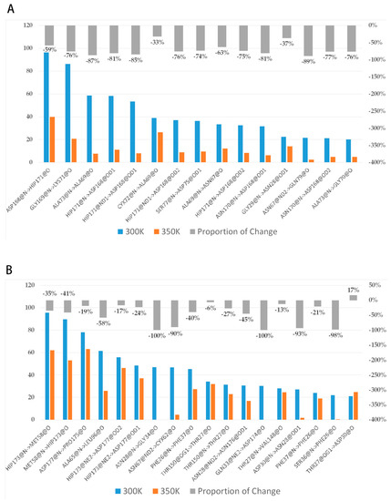 To investigate the reasons for conformational change, we analyzed the interactions among residues. Many studies have confirmed that hydrogen bonds make a very important contribution to the stability of protein [38,39], so we first grouped the highly flexible region separately, then took the last 80 ns equilibrium trajectories at two temperatures and calculated the average of intra-group (between group members) and inter-group (out-group residues) hydrogen bonds for three simulations. The trend in the number of both hydrogen bonds over time was counted (Figure A4). It was found that the number of intra-group hydrogen bonds decreased significantly after heating up, with the average value dropping from 10 to near 7; the number of inter-group hydrogen bonds was close to 12–13, and the high temperature did not have a significant effect on it. This difference may be related to the hydrogen bond breaking and forming. Hydrogen bonds with a probability of occurrence of not less than 20% at 300 K were screened and the change in probability after heating up was calculated (Figure 10A). The results showed that there were 15 important hydrogen bonds in the group, and the probability of appearing after heating up showed a precipitous drop, with all hydrogen bonds dropping by more than 30%, and 73% of them dropping by more than 70%. This indicated that there is a certain correlation between the level of thermal stability and the increase in hydrogen bonds. The intensification of molecular motion brought by high temperature severely damaged the intra-group hydrogen bonds, so their ability to maintain the region stability was significantly reduced correspondingly. The decrease in the inter-group hydrogen bonds was not as drastic as that of the intra-group, only about 56% of the hydrogen bonds dropped by more than 30% (Figure 10B). In addition, the intra-group hydrogen bonds were all from the same secondary structure, in other words, the residue pairs generating hydrogen bonds were relatively close in sequence, while the proportions of some inter-group ones across multiple secondary structures were highly variable such as HIP173-MET58 (from loop 11 and loop 6), GLN33-ASP174, and ASN28-ASN176 (from loop 3 and loop 11), ALA65-LEU96 (from loop 6 and loop 7), etc. These hydrogen bonds make contributions to maintain the relative positions between secondary structures, and the breaking implies that a high temperature leads to a significant change in the relative positions.