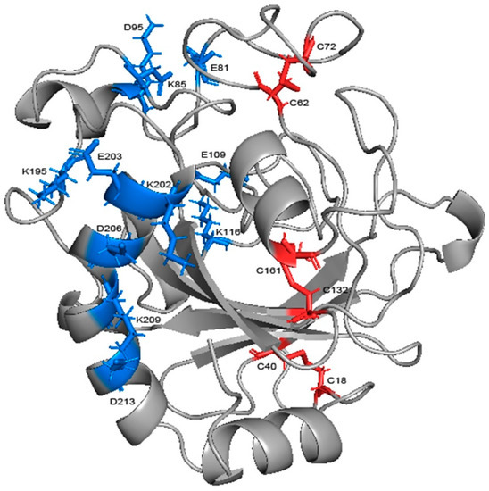 The salt bridges and disulfide bonds in the structure of chitosanase. The blue sticks represent salt bridges and the red ones represent disulfide bonds.