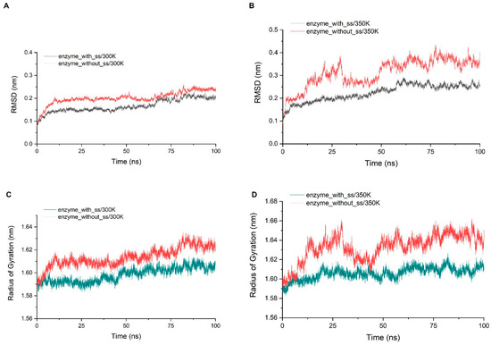 (A,B) show the comparison of the RMSD average values of three simulations at 300 K and 350 K between the chitosanase with and without disulfide bonds; (C,D) show the comparison of the average of the radius of gyration of three simulations at 300 K and 350 K between the chitosanase with and without disulfide bonds.
