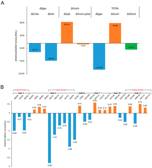 (A) shows the compositions of the binding free energy; (B) shows the decomposition of the binding energy on the residues and the second structures and highly flexible regions that these residues belong to.