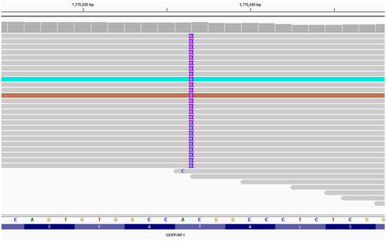 We found a nucleotide sequence frameshift insertion (5 nucleotide duplications) variant in exon 3 of the SERPINF1 gene (chr17:1,770,026A>ACGGCC) (Figure 1). The variant was not previously described in databases. The variant results in the replacement of threonine at position 84, which leads to the premature formation of a stop codon and impairs protein synthesis (p.T87fs; NM_001329903). This nucleotide sequence variant was not registered in the gnomAD database. Thus, according to the ACMG (The American College of Medical Genetics and Genomics) criteria, this variant of the nucleotide sequence is regarded as pathogenic.