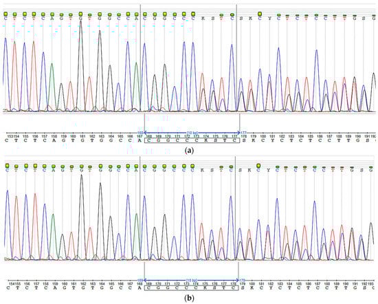 Sanger sequencing: c.259_260insCGGCC heterozygous mutation; (a) mother (b) father.