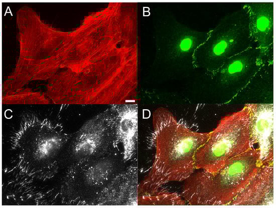 Fibronectin fibrils preferentially occur at cell voids in epithelial monolayers. Studies of incomplete epithelial cell monolayers indicated that FN fibril assembly preferentially occurred at free edges of the monolayer in the presence of 2 ng/mL TGF-1. Immunofluorescence images of (A) F-actin (red), (B) E-cadherin (green), and (C) FN (white) are shown ((D) composite image). Scale bar 10 m.