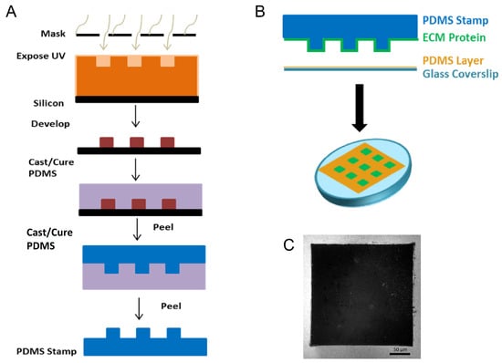 Uniform square islands were generated as previously described [,,]. Briefly, a negative mold of an array of 250 µm × 250 µm squares was fabricated through photolithography on a silicon wafer (Figure 3). A replica-mold of polydimethylsiloxane (PDMS) raised stamps was coated with laminin (LN). The stamp was then placed into contact with UV-treated, PDMS coated, glass coverslips to facilitate covalent bonding. Coverslips were fabricated through spin coating of a thin layer (>10 µm) of Sylgard 184 PDMS (1:10 w:w curing agent to base) onto the coverslips and baking overnight at 60 °C. After stamping, coverslips were treated with fluorescently labeled BSA to label the region outside of the square pattern and 1% Pluronics F-127 to prevent cells from adhering outside of the square patterns. LN was used to coat stamps to prevent acquisition of confounding results from FN interactions.
