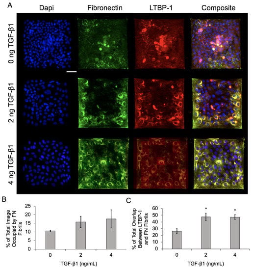 To quantify LTBP-1 colocalization with FN fibrils, immunofluorescence images of LTBP-1 and FN were analyzed via an image processing algorithm in Matlab that creates a binary mask of each LTBP-1 image, as well as each FN image, and determines the areas in which LTBP-1 overlays FN fibrils per image.