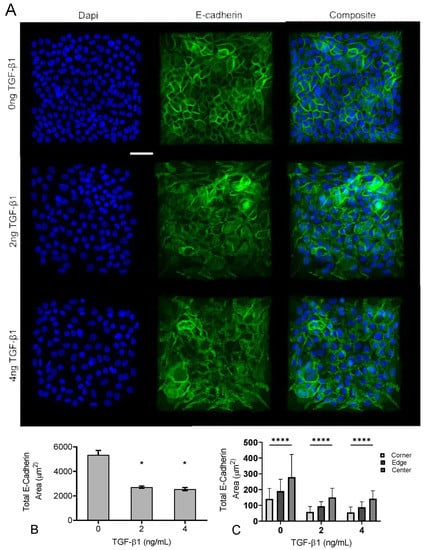 We next examined adherens junctions in the epithelial colonies in response to increasing concentrations of TGF-1. A prominent endpoint of EMT signaling is the loss of E-Cadherin from adherens junctions []. To quantify both the degree of E-Cadherin loss and the spatial gradient of E-Cadherin loss, we immunofluorescently labeled cells for E-Cadherin and quantified the junctional area containing E-Cadherin. Representative images are shown in Figure 6A, and quantified E-Cadherin area is shown in Figure 6B. Data indicate that as TGF-1 concentration increases, there is a reduction in E-Cadherin area. We then quantified spatial localization of E-cadherin-containing adherens junctions, again dividing the islands into a 5 × 5 bin and quantifying E-Cadherin area in each region (corner, edge, and center) (Figure 6C). Results indicate a spatial localization of E-Cadherin-containing junctions, with smaller E-Cadherin area in the corners, relative to the edge and center of the cell. While TGF-1 decreased E-Cadherin area, spatial localization of E-Cadherin was observed across all doses of TGF-1. These data demonstrate that E-Cadherin-containing junctions are spatially patterned, consistent with previously published work [], but suggest that this gradient occurs independent of TGF-1.