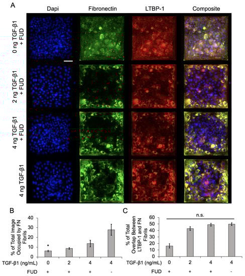 To address this, we treated epithelial cell islands with the Functional Upstream Domain (FUD) of the S. Pyogenes protein F1 Adhesin. Previous studies have demonstrated that this 49-amino acid fragment is a potent inhibitor of FN fibril formation, but does not affect FN secretion or integrin binding to FN []. Cells were treated with 125 nM FUD, which has previously been shown to be an effective dose for inhibiting FN fibril assembly [], along with 0, 2, or 4 ng/mL TGF-1. Cell islands were treated with 4 ng/mL TGF-1 alone (without FUD) as a positive control. Representative images of nuclei, FN, and LTBP-1 are shown in Figure 7A. Results indicate that FN fibril formation was significantly reduced relative to the positive control (Figure 7B). Despite the reduced assembly of FN fibrils, we observed a similar degree of colocalization of LTBP-1 to FN fibrils (Figure 7C), suggesting that while there are fewer FN fibrils in the FUD-treated cases, there is still a similar degree of latent TGF-1 localized to these fibrils.