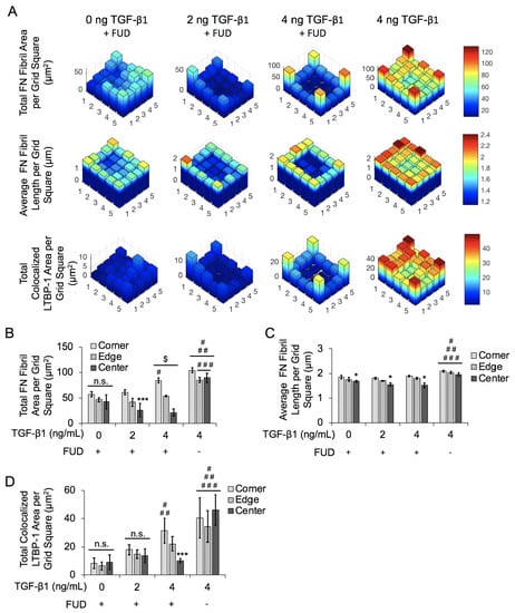 We next examined the spatial gradients of FN fibrils as before, dividing the islands into 5 × 5 bins and averaging values in each bin. We again collated data for the four corner bins, the 12 edge bins, and and the nine center bins (Figure 8). The average value for each bin is shown in Figure 8A for total FN fibril area, FN fibril length, and LTBP-1 colocalization to FN fibrils. Results indicate that even though the overall degree of FN fibril formation is reduced relative to the positive control, TGF-1 still induces a spatial gradient of FN, with more and larger fibrils in the corners and edges of the square. LTBP-1 colocalization is also greater in the corners and edges of the square relative to the center. These data indicate that while FUD reduces the overall degree of FN fibrillogenesis, a spatial gradient of FN fibril formation is still maintained.