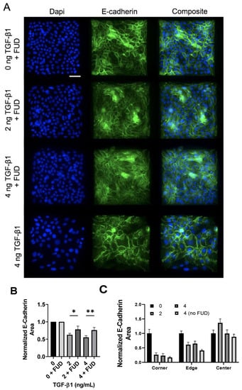 To assess the effects of FN fibril inhibition on E-Cadherin, we again treated cells with 125 nM FUD along with 0, 2, or 4 ng/mL TGF-1. Cell islands were again treated with 4 ng/mL TGF-1 alone (without FUD) as a positive control. Representative images are shown in Figure 9 and show that TGF-1-dependent decreases in E-Cadherin are significantly lessened in the presence of FUD (Figure 9B).