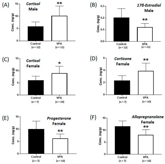 Concentrations of cortisol (A) and 17β-estradiol (B) in neonatal valproic acid (VPA)-exposed 4-week-old male rat cortex and concentrations of cortisol (C), cortisone (D), progesterone (E), and allopregnanolone (F) in neonatal VPA-exposed 4-week-old female rat cortex compared to those in the controls. Values represent the mean ± standard deviation (SD) of individual samples. The significance level between the control and the exposure groups is indicated by * p < 0.05, ** p < 0.01.