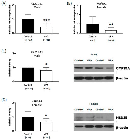An experiment was conducted to determine whether the changes in steroid hormone levels were due to alterations in the expression of metabolizing enzymes, such as aromatase (an enzyme that is encoded by the cytochrome P450 19A1 gene (Cyp19a1) and catalyzes the conversion of androgen to estrogen) and 3β-hydroxysteroid dehydrogenase (an enzyme that is encoded by Hsd3b1 and is involved in progesterone synthesis). The mRNA expression levels of Cyp19a1 and Hsd3b1 were measured using real-time qPCR with neonatally exposed 4-week-old rat cortex samples. There were no significant difference in the mRNA expression of Cyp19a1 in female cortices and Hsd3b1 in male cortices between the control and the VPA-exposed group (Supplementary Figure S1). However, decreased Cyp19a1 mRNA levels were observed only in the VPA-exposed male cortices (Figure 2A; p < 0.001), and decreased Hsd3b1 mRNA levels were observed only in the VPA-exposed female cortices (Figure 2B; p = 0.003). Furthermore, decreased CYP19A1 protein levels in the male cortices (Figure 2C; p = 0.015) and decreased HSD3B1 level in the female cortices (Figure 2D; p = 0.027) were confirmed using Western blot analysis.