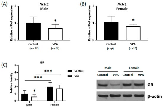 Decreased expression of glucocorticoid receptors (GRs) was observed only in the neonatal VPA-exposed male cortex. Relative expressions of Nr3c1 mRNA measured by real-time qPCR in the neonatal VPA-exposed 4-week-old rat cortex (A,B). Representative Western blots (C Right). Quantification of GR protein levels in the cortex (C Left). β-actin was used as the loading control to normalize the content of each sample. * p < 0.05, *** p < 0.001.