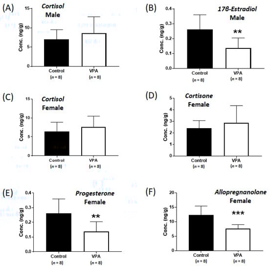Concentrations of cortisol (A) and 17β-estradiol (B) in the cerebral cortices of prepubertal VPA-exposed 8-week-old male rats and concentrations of cortisol (C), cortisone (D), progesterone (E), and allopregnanolone (F) in the cerebral cortices of prepubertal VPA-exposed 8-week-old female rats compared to those in the controls. Values represent the mean ± standard deviation (SD) of individual samples. The significance level between the control and exposure groups is indicated by ** p < 0.01, *** p < 0.001.