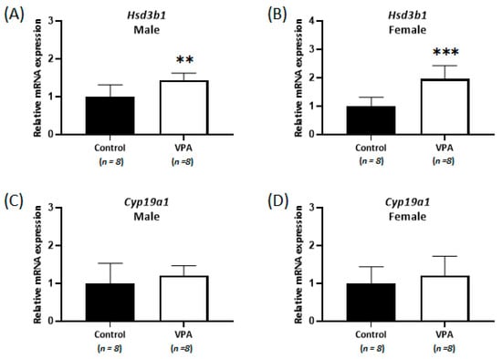 However, the mRNA levels of Cyp19a1 were not significantly different in the 8-week-old cortices (Figure 5C,D), although the levels of 17β-estradiol (controls: 0.26 ± 0.10 ng/g, VPA: 0.14 ± 0.07 ng/g; p < 0.01, Figure 4B) in the 8-week-old male cortex and the progesterone (controls: 12.1 ± 3.4 ng/g, VPA: 7.5 ± 2.7 ng/g; p < 0.01, Figure 4E) and allopregnanolone (controls: 12.4 ± 3.1 ng/g, VPA: 7.6 ± 1.4 ng/g; p < 0.001, Figure 4F) in the 8-week-old female cortex were still significantly decreased compared to those in the controls, similar to that observed in the neonatal VPA-exposed models (Supplementary Table S5).