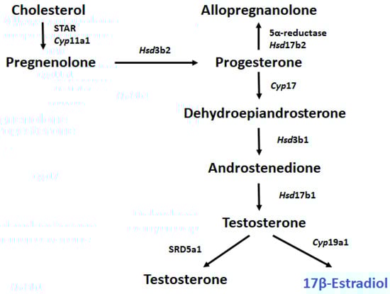 Steroid hormones control many physiological processes, such as stress responses, and are mainly produced by the endocrine glands []. Moreover, steroids produced within the nervous system are termed “neurosteroids” []. During neurosteroid synthesis, cholesterol metabolized to progesterone by 3β-HSD can be further metabolized to androgens (androstenedione and testosterone) and transformed into estrogens through aromatization [], Figure 6. Estrogens potentiate glutamate responses primarily by bolstering N-methyl-d-aspartate (NMDA) receptor activity, affecting GABAergic mechanisms and altering brain morphology by increasing dendritic spine density []. Progesterone and allopregnanolone, endogenous 5α-reductase metabolites, are potent modulators of the γ-aminobutyric acid A (GABAA) receptor, and several studies have reported that preterm birth causes major deficits in GABAA receptor neurosteroid signaling processes in the developing brain, leading to reduced exposure to the normal neurosteroid environment during late pregnancy [,].