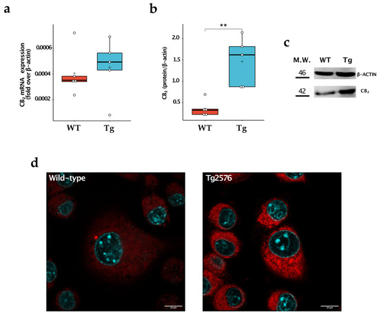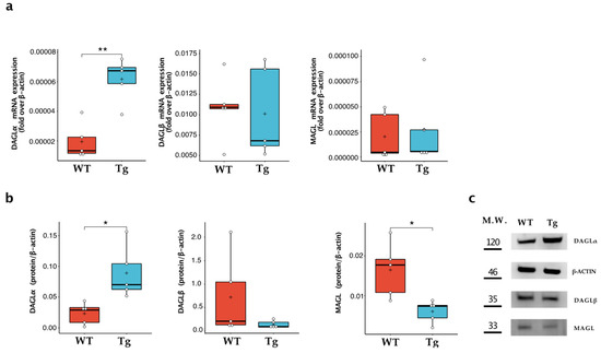 Characterisation of 2-AG metabolic enzymes in wild-type microglia (WT) and Tg2576 microglia (Tg). Enzymes of synthesis (i.e., DAGLα and DAGLβ) and degradation (i.e., MAGL) were quantified (a) for their mRNA content by quantitative real-time polymerase chain reaction and (b) for their protein expression by Western blot analysis. Horizontal line and + within the rectangle (boxplot) represent the median and the mean, respectively, of the values of five independent experiments (white circles). Significance is shown as a p value, calculated using an unpaired t-test. * p < 0.05; ** p < 0.01. (c) Representative immunoblot showing the expression of the indicated protein.