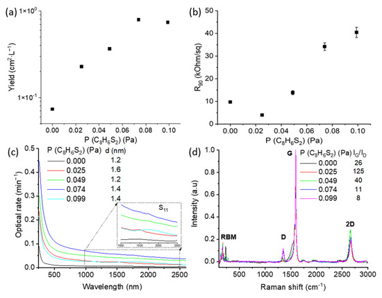 (a) Influence of bithiophene on SWCNT deposition rate, (b) equivalent sheet resistance, (c) UV-vis-NIR, and (d) Raman spectra for SWCNTs obtained with different bithiophene contents; RBM stands for radial breathing modes—a fingerprint of SWCNTs.