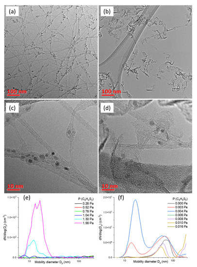Typical TEM images of carbon nanotubes produced (a,c) without bithiophene and (b,d) with 0.08 Pa of bithiophene. DMA number size distributions of aerosol particles produced when bithiophene is supplied (e) in pure nitrogen and (f) in the ferrocene-CO mixture adjusted for SWCNT growth with the same residence time at 1000 °C.
