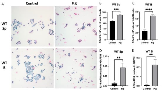 2.1. CD45+IL-10+ Cells and IL-10 Expression in Splenocytes and Purified B Cells from WT Mice Were Increased by P. gingivalis Challenge