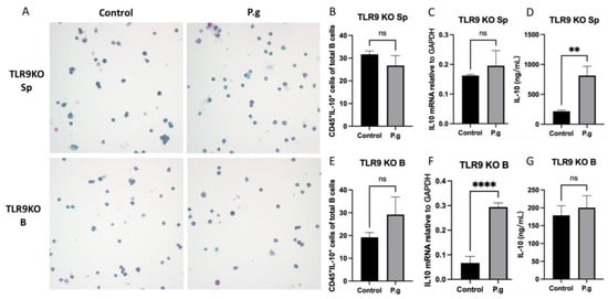 When splenocytes from pre-immunized TLR9KO mice were treated with P. gingivalis, no change in the percentage of CD45+IL-10+ cells was observed compared to control (Figure 2A,B). There were no significant changes in IL-10 mRNA transcripts that can be detected compared to the untreated control group (Figure 2C). However, the IL-10 protein secretion detected by ELISA showed a significant increase in treated splenocytes compared to untreated control (Figure 2D). On the other hand, there were no changes in CD45+IL-10+ cells percentages when purified B cells were treated with P. gingivalis compared to the control group (Figure 2A,E). While IL-10 mRNA transcripts were significantly increased in treated B cells from TLR9KO mice (Figure 2F), no difference in IL-10 protein production was observed between treated and untreated cells (Figure 2G).