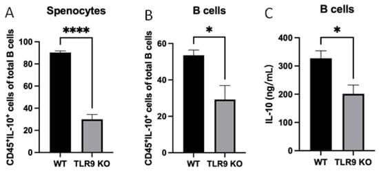To determine the role of TLR9 signaling in CD45+IL-10+ cell formation and IL-10 production, splenocytes and purified B cells were assayed together after treatment with P. gingivalis (5 × 108/mL) for 48 h. The percentage of CD45+IL-10+ cells was significantly lower in cultured splenocytes and B cells from TLR9KO mice compared to those from WT mice after P. gingivalis stimulation (Figure 3A,B). Furthermore, ELISA results showed that IL-10 production in cultured B cells from TLR9KO mice in response to P. gingivalis stimulation was also reduced compared to treated B cells from WT mice (Figure 3C).