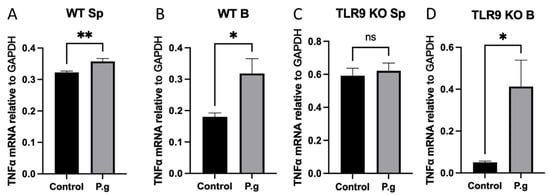 In order to determine the specificity of the observed B cell response in cultured conditions, the transcript level of TNF-α in cultured splenocytes and B cells was determined by RT-qPCR. The results demonstrated that TNF-α expression was significantly increased in cultured splenocytes and B cells from WT mice when treated with P. gingivalis (Figure 4A,B). On the other hand, TNF-α expression did not change in cultured splenocytes from TLR9KO mice but showed a significant increase in cultured B cells from TLR9KO when treated with P. gingivalis (Figure 4C,D). These data suggest that TNF-α expression in B cells is TLR9-independent.