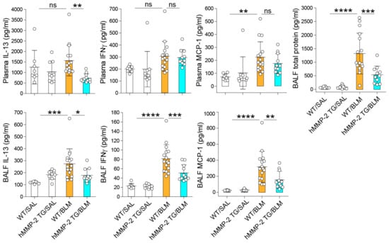 2.3. Reduced BALF Levels of Inflammatory Cytokines and Total Protein in hMMP-2 TG Mice