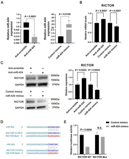 2.4. MiR-424 Regulates AKT Phosphorylation through RICTOR-Dependent Mechanism