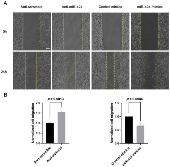 MicroRNAs (miRNAs) are small regulatory molecules that function as negative regulators of gene expression at the post-transcriptional level by targeting the 3′ untranslated region of the mRNA and thereby modulate diverse biological processes, such as neuronal differentiation, development, plasticity, and survival []. miRNAs have also been observed to be dysregulated in a variety of pathological conditions, including cancer, neurodegenerative diseases, and cardiovascular diseases [,,]. The ability of chosen miRNAs to target various mRNAs that are changed in pathological conditions makes these molecules interesting candidates as targets of therapeutics (in the form of anti-miRNAs) or as therapeutics (in the form of miRNA mimics) []. More recently, increasing evidence indicates that numerous miRNAs are altered in HSCR, and these regulators are involved in modulating the pathogenesis of HSCR by directly suppressing a variety of functional targets [,]. Of note, recent studies indicate that miR-424 plays important roles in regulating cell migration, and indeed overexpression of miR-424 inhibits the migration in various cell types, such as vascular smooth muscle cells, human umbilical vein endothelial cells, and glioblastoma cells [,,].