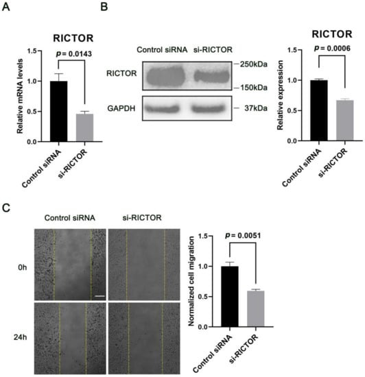 Protein lysates were harvested and the concentrations were determined by PierceTM BCA Protein Assay Kit (Thermo Fisher Scientific, USA). Western blot analysis was carried out using a standard procedure, as previously described []. The following primary antibodies were used following the manufacturer’s instructions: RICTOR (Bethyl Laboratories, #A300-459A, TX, USA, 1:2000), AKT (Cell Signaling Technology, #9272S, MA, USA, 1:2000), p-AKT (S473) (Cell Signaling Technology, #4060S, MA, USA, 1:2000), and GAPDH (Santa Cruz, #sc-25778, TX, USA, 1:2000). Antibody detection was carried out using HRP-linked anti-rabbit IgG antibody (Cell Signaling Technology, #7074S MA, USA), followed by the ECL reaction (Millipore, Burlington, MA, USA). The signals from a fluorescent Western blot were quantified using the ImageJ software.