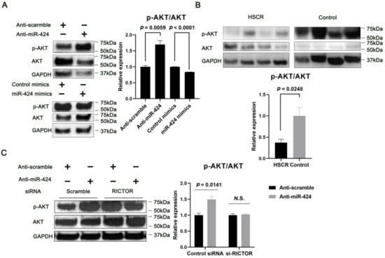 miR-424 modulates AKT phosphorylation via RICTOR. (A) The effects of miR-424 on AKT phosphorylation in human neural cells. SH-SY5Y cells were transfected with miR-424 mimics, anti-miR-424, or the corresponding controls. AKT phosphorylation at Ser473 (p-AKT) was assessed by Western blotting 72 h post-transfection. Representative blots are present. GAPDH serves as a loading control. Error bar = SEM (standard error of the mean); n = 3. (B) Western blot analysis of AKT phosphorylation in the colonic tissues from patients with HSCR (n = 4) and controls (n = 4). Error bar = SEM. (C) Knock-down of RICTOR rescues the anti-miR-424-induced increase in AKT phosphorylation. SH-SY5Y cells were co-transfected with anti-scramble or anti-miR-424, and control siRNA or siRNA cognate to RICTOR for 72 h. Representative blots show the levels of AKT phosphorylation. Error bar = SEM; N.S., not significant; n = 3.