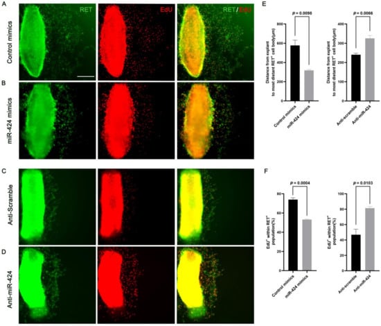 Since disturbances in ENCC migration along the developing gut can result in Hirschsprung disease, we next interrogated the role of miR-424 in modulating ENCC development. In order to assess ENCCs moving on a migration-permissive surface, we cultured E12.5 midgut slices on fibronectin in the presence of glial cell-derived neurotrophic factor (GDNF), a potent chemoattractant for ENCCs []. miR-424 overexpression significantly hindered RET+ cell migration out of the intestinal explants (Figure 7A,B,E), and reduced DNA synthesis, as shown by the number of EdU+ cells (Figure 7A,B,F). On the contrary, inhibition of miR-424 dramatically promoted migration of RET+ cells out of the explants (Figure 7C–E) and also markedly boosted ENCC proliferation (EdU+ cells) (Figure 7C,D,F). Collectively, our ex vivo findings allow us to conclude that in the developing gut, miR-424 plays a crucial role in regulating ENCC migration and proliferation, which is also essential for ENCCs to efficiently colonize the distal intestine [].