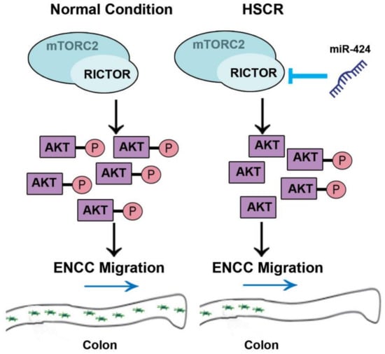 In the present study, we show that miR-424 is markedly up-regulated in HSCR tissues, and this small molecule regulates the migration of human neural cells by directly targeting RICTOR. Overexpression of miR-424 leads to decreased levels of AKT phosphorylation and thereby inhibits the processes of cell migration. More importantly, our ex vivo model demonstrates that miR-424 plays a crucial role in regulating ENCC migration and proliferation in the developing gut. The characteristics of RICTOR and AKT expression are further determined by using single-cell atlases of gene expression in both human and mouse fetal intestines.