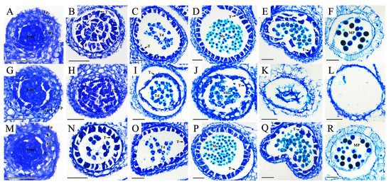 - Ferguson, A.C.; Pearce, S.; Band, L.R.; Yang, C.; Ferjentsikova, I.; King, J.; Yuan, Z.; Zhang, D.; Wilson, Z.A. Biphasic regulation of the transcription factor ABORTED MICROSPORES (AMS) is essential for tapetum and pollen development in Arabidopsis. New Phytol. 2017, 213, 778–790. [Google Scholar] [CrossRef]