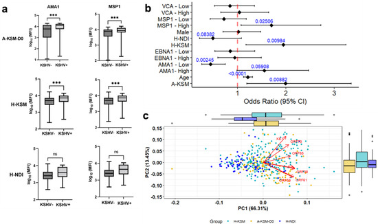 Distinct KSHV serological signature during acute malaria episodes. (a) Plot of anti-malarial IgG antibodies in KSHV seropositive relative to seronegative children from western Kenya. Significant differences are based on the Wilcoxon rank-sum test with Benjamini–Hochberg correction for multiple comparisons where appropriate (ns: p > 0.05; *** p < 0.001). Boxplots include the sample medians, minimum/maximum values, and first/third quartiles. (b) Forest plot of multivariate logistic regression analysis of determinants of KSHV seropositivity in the three study populations. (c) Study participants are clustered based on their anti-KSHV IgG antibodies into malaria-endemic vs. sporadic regions (PC 1) and acute malaria vs. healthy children from Kisumu (PC 2). Outer boxplots and whiskers show distribution of KSHV IgGs in A-KSM and H-KSM compared to H-NDI KSHV IgG combinations along both principal component 1 (PC1) and PC2. Abbreviations: A-KSM, children with acute malaria from Kisumu; H-KSM, healthy children from Kisumu; H-NDI, healthy children from Nandi; VCA, EBV Viral Capsid Antigen; EBNA1, Epstein–Barr nuclear antigen 1; MSP1, P. falciparum malaria Merozoite surface protein-1; AMA1, P. falciparum malaria Apical Membrane Antigen-1.