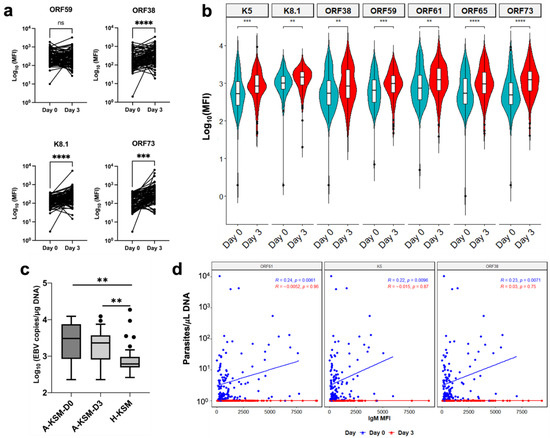 To further assess the effects of acute malaria episodes on KSHV latency, we performed a pairwise comparison of anti-KSHV IgG and IgM antibodies in pre- (A-KSM-D0) and post-treatment samples (A-KSM-D3). From the pairwise comparisons, IgG antibodies against ORF38 (p < 0.0001), K8.1 (p < 0.0001), and ORF73 (p = 0.0002) antigens were significantly higher at day 3 compared to day 0 (Wilcoxon matched-pairs test, Figure 3a). Consistent with this IgG pattern, anti-KSHV IgM were significantly elevated in A-KSM at day 3 compared to paired A-KSM samples at day 0 (Figure 3b). To confirm if the serological pattern is indicative of ongoing lytic reactivation, we assayed both KSHV and EBV loads at both recruitment and last day of malaria treatment. In the acute malaria-infected cohort, KSHV load was undetectable both in whole cell pellets and cell-free plasma using droplet digital PCR (ddPCR). This result was not due to an inability to detect KSHV by the assay, as KSHV+ controls included in each plate had a consistent range of viral copies/µL of DNA (Tables S1 and S2). In contrast to KSHV, the EBV load was significantly elevated in acute malaria relative to healthy Kisumu children (Figure 3c), independent of KSHV seropositivity (Figure S3, left panel), which was consistent with previous studies from the same region [21,22]. Though malaria parasite load at recruitment was independent of KSHV seropositivity (Figure S3, right panel), we observed a modest relationship between parasitemia and IgM antibodies against lytic KSHV antigens. At day 0, IgM antibodies against K5, ORF61, and ORF38 antigens are therefore positively correlated with parasite density (Figure 3d).