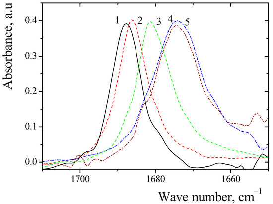 IR spectra of the C=O group of sarcosine anhydride in solvents: 1—tri-ethylamine; 2—diethyl ether; 3—tetrahydrofuran; 4—acetonitrile; 5—nitromethane.