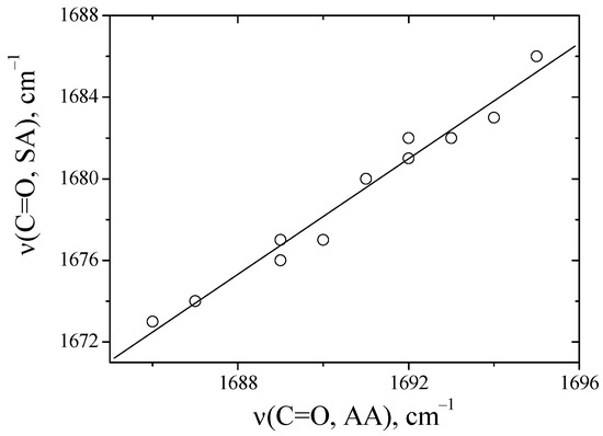 In the medium, for benzene, we observed the absorption of the free C=O group of sarcosine anhydride (Figure 5). Increasing the concentration of alcohol gave rise to an additional line, which corresponds to the C=O groups of complex of the anhydrides with alcohol. The absorption frequencies of C=O groups in complexes between anhydrides and aliphatic alcohols in aprotic solvents are given in Table 3. The absorption frequencies of complexes C=O group of dipeptide with alcohols were compared with SVW parameters (Figure 6). In all cases, observed linear correlations with the parameters are presented in Table S2.