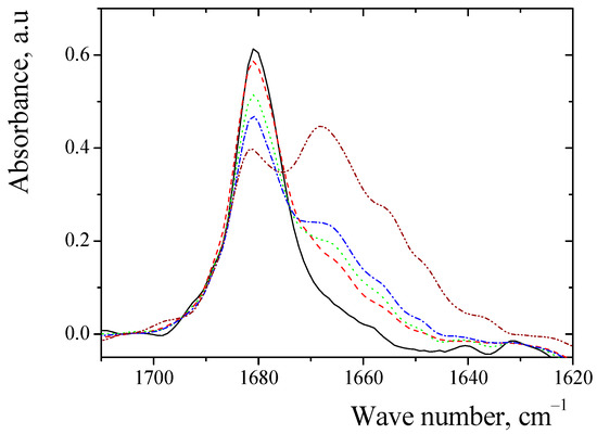 IR was measured using a Bruker Vector-22 FT-IR spectrometer (Billerica, MA, USA). All absorption spectra were measured in the range from 400 to 4000 cm−1. The interferograms were recorded with a resolution of 1 cm−1 and Fourier transformed using a Blackman–Harris apodization function. The number of scans used in a particular experiment was 64. We used KBr (0.266 and 0.545 mm) and CaF2 (0.020, 0.545 or 1 mm) cells. At the overlap the bands of C=O groups of cyclic dipeptide (in practically for alanine anhydride), the band was divided into components using Peak Fit 4.0 software.