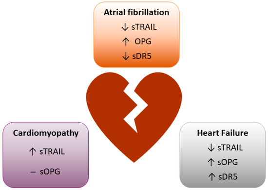 | Cardiomyopathy | TRAIL | Increased systemic TRAIL in dilated cardiomyopathy patients | [54] |