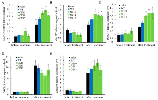 - Dubouzet, J.G.; Sakuma, Y.; Ito, Y.; Kasuga, M.; Dubouzet, E.G.; Miura, S.; Seki, M.; Shinozaki, K.; Yamaguchi-Shinozaki, K. OsDREB genes in rice, Oryza sativa L., encode transcription activators that function in drought-, high-salt- and cold-responsive gene expression. Plant J. 2003, 33, 751–763. [Google Scholar] [CrossRef] [PubMed]