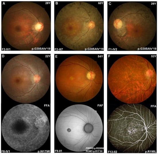 - Renner, A.B.; Fiebig, B.S.; Weber, B.H.; Wissinger, B.; Andreasson, S.; Gal, A.; Cropp, E.; Kohl, S.; Kellner, U. Phenotypic variability and long-term follow-up of patients with known and novel PRPH2/RDS gene mutations. Am. J. Ophthalmol. 2009, 147, 518–530.e1. [Google Scholar] [CrossRef] [PubMed]