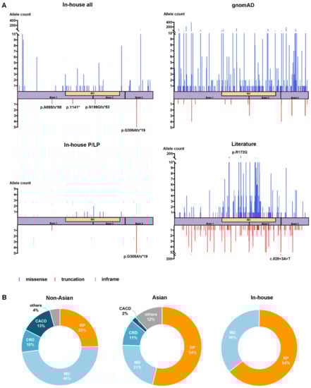 SPSS Statistics (Version 25.0; IBM Corp., Armonk, NY, USA) was used for the statistical analysis. The phenotypic spectrum, especially the proportion of RP and MD, was compared (1) among all published non-Asian families in the literature, published Asian families, and in-house families; (2) among reported families caused by variants that were predicted with different degrees of pathogenicity; and (3) among reported individuals with different ages of onset, using the chi-square test. The distribution of variants that were predicted with different classes of pathogenicity (outside and inside the ID2 domain) and BCVA among reported patients with different ages of examination were also compared by performing the chi-square test. The age of onset between reported patients with RP and MD, respectively, was compared by performing the Mann–Whitney U test. A P-value of less than 0.05 was used to determine statistically significant differences.