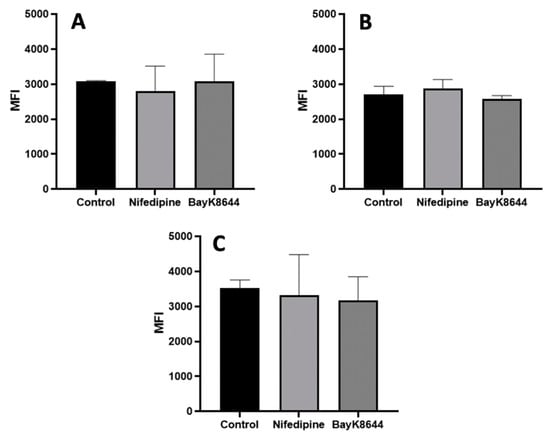 In order to measure the store-related iCa2+ changes, the cells were treated with nifedipine and BayK8644 for 24 h, divided into flow cytometer tubes, stained with the Cal520 dye, as previously described, and the basic iCa2+ level was measured with a Calibur cytometer. This flow cytometer allows for the measurement of instant iCa2+ changes. After 90 s of measurement, the 1 μM of ionomycin, iCa2+ releasing ionophore, was added (Santa Cruz Biotechnology, Dallas, TX, USA) and the iCa2+ change was recorded for ~200 s. The data were analyzed using FlowJo software, version 10 (FlowJo Corp., Ashland, OR, USA). The median fluorescence intensity (MFI) of all samples was calculated by subtracting the MFI of non-stained cells from the MFI of Cal-520 stained cells. Before the addition of ionomycin, measured MFI of the cells was held as basal iCa2+ and after 90 s of adding ionomycin—as a high level of iCa2+.