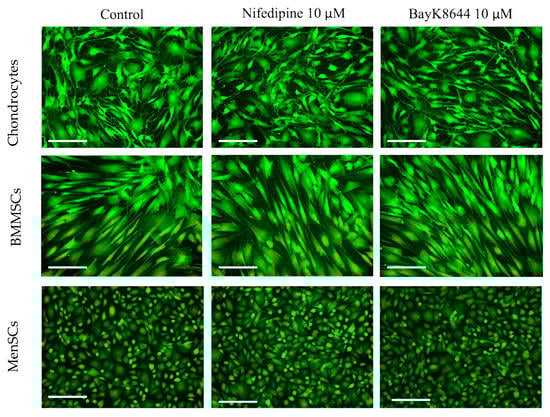 The iCa2+ levels in MenSCs, BMMSCs and chondrocytes cultivated in a monolayer, affected with nifedipine (10 μM) or BayK8644 (10 μM) for the 3 days and stained with Cal-520 dye. Control–cells without nifedipine or BayK8644. Cells were visualized with EVOs fluorescent microscope; the representative micrographs are shown. Scale bar 200 μm.