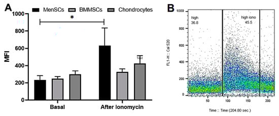 The ionomycin-induced iCa2+ release in MenSCs, BMMSCs and chondrocytes. Cells were stained with Cal-520 and analyzed with flow cytometer (Calibur). (A) The iCa2+ fluorescence is shown as mean fluorescence intensity (MFI) ± standard deviation (SD) before and 90 s after adding the ionomycin (1 μM). * Data are shown as mean ± standard deviation (SD) and are considered significant at p ≤ 0.05 (n = 5). (B) The representative cell population measurement before and after adding the ionomycin (1 μM at 90 s). The two-way ANOVA was used to compare cells.