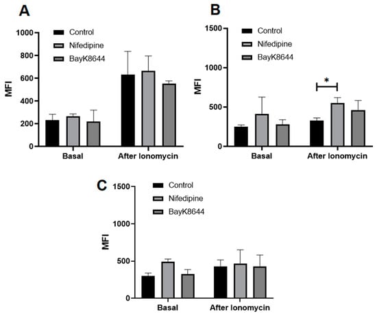 Since the application of ionomycin resulted in a significantly higher level of iCa2+ in MenSCs, as compared to the other types of cells (Figure 3), we further investigated whether the iCa2+ store levels in all three cell types can be changed by their preincubation with nifedipine and BayK8644 for the 24 h. Data show the ionomycin-induced release of calcium from the intracellular stores remained to be the highest in MenSCs, as compared to the other types of cells, while it was not considerably altered by the incubation with nifedipine or BayK8644 (Figure 4A).
