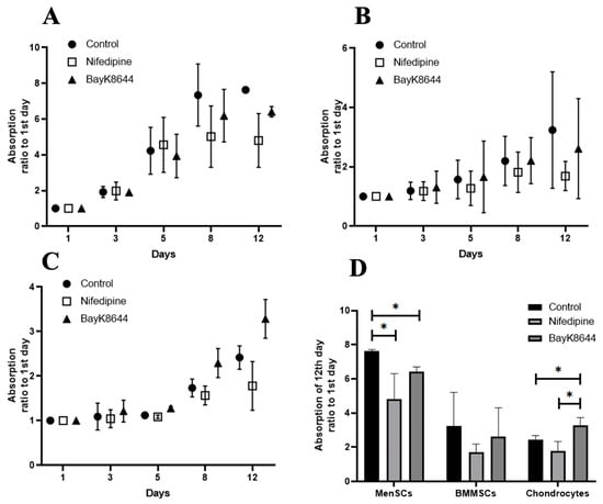 The effect of nifedipine and BayK8644 on MenSCs, BMMSCs and chondrocytes proliferation. Proliferation of MenSCs (A), BMMSCs (B) and chondrocytes (C) after the treatment with nifedipine (10 μM) and BayK8644 (10 μM) for 1, 3, 5, 8, and 12 days. Proliferation was measured using CCK-8 assay. Proliferation rate is shown as a ratio of CCK-8 absorbance (450 nm) to the 1st day of cell adherence. (D) The effect of nifedipine on the 12th day of cell proliferation. * Data are shown as mean ± standard deviation (SD) and are significant at p ≤ 0.05 (n = 3) measuring three different donor samples-derived cells of each type using a two-way ANOVA.