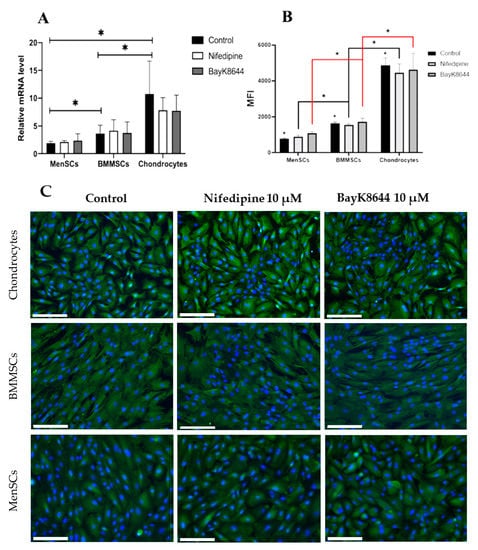 Surprisingly, the expression of CACNA1C in MenSCs was the lowest, while in chondrocytes was the highest (Figure 6A). The highest CACNA1C expression in chondrocytes could be related to their highest level of iCa2+ compared to the other cells. No significant change in CACNA1C gene expression was observed after the cell’s treatment with nifedipine and BayK8644 for the 3 days.